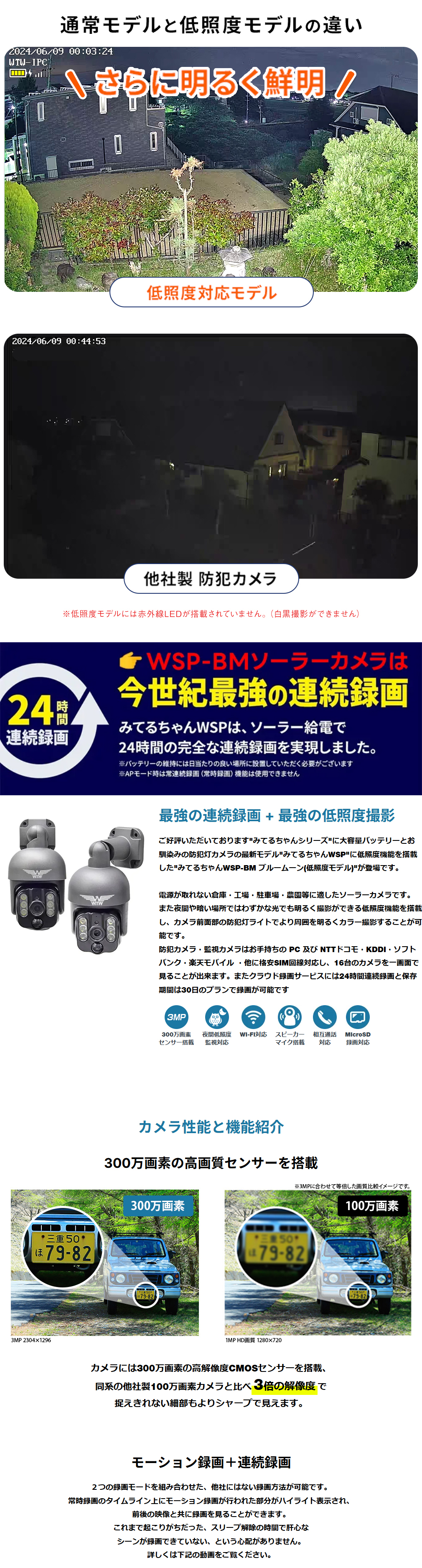 みてるちゃんWSP-BMブルームーン(低照度モデル)は、低照度機能を搭載しており、夜間や周囲が暗い場所にわずかな光を増幅して周囲を明るくカラーで撮影することができる低照度カメラとなり、また防犯灯が搭載しているので光がない場所でもLEDライトの光を使ってより明るく撮影することが可能なモデルとなります。