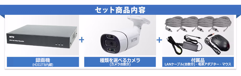 標準カメラA バレッド型防犯灯カメラ ◆【製品1年保証】WTW-XPR23192EAW【追加金額無し】 グレードアップA【+3000円】屋内天井取付ドーム型防犯灯カメラ ◆【製品1年保証】WTW-XPDR1972EAW 【予約受付】グレードアップB【+21600円】広角~中望遠監視向け 赤外線カメラ ◆【製品1年保証】WTW-XPR213E 【予約受付】グレードアップC【+28800円】広角~中望遠監視向け 赤外線カメラ ◆【製品1年保証】WTW-XPR228E